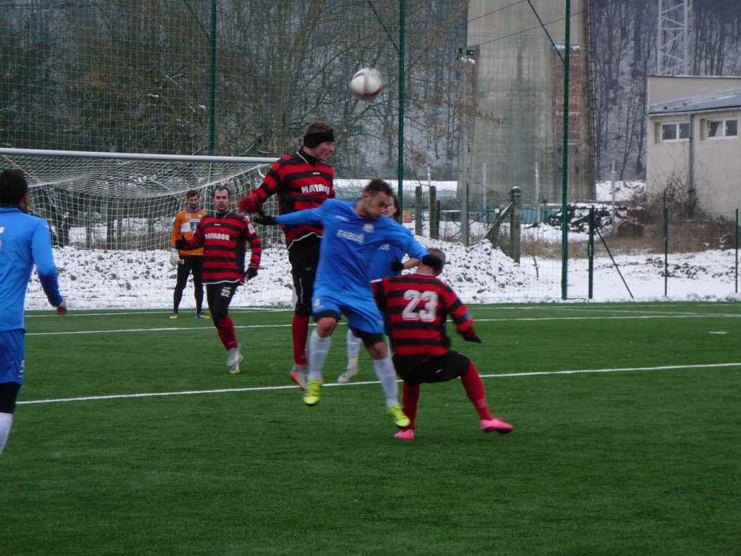 Patrik Mynář odvracia loptu v hlavičkovom súboji, dole s č. 23 Marek Zuziak