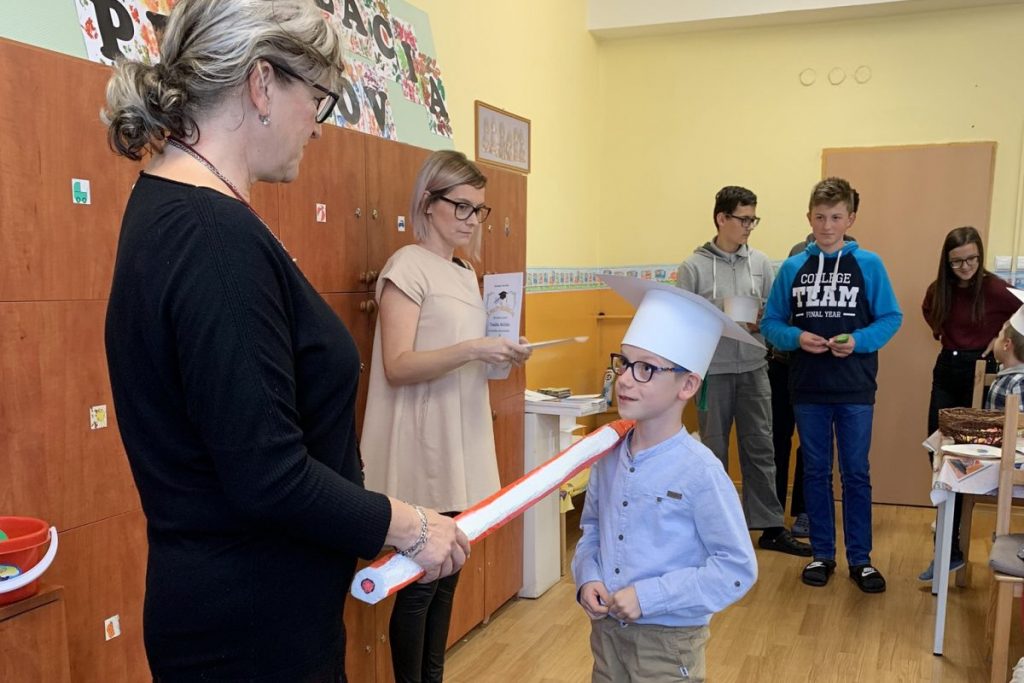 A potom už nič nebránilo tomu, aby ich po spoločnom slávnostnom sľube, v ktorom prisľúbili, že sa budú dobre učiť, slušne správať, kamarátiť so všetkými spolužiakmi, poslúchať a vzorne reprezentovať našu školu na verejnosti, pani riaditeľka Mgr. Viera Flimmelová slávnostne imatrikulovala rozprávkovou pastelkou. Deti si domov odniesli krásne čiapky, ktoré pre nich pripravili v školskom klube detí, imatrikulačné listiny, odznak s maskotom školy a tiež sladkú odmenu za vynaloženú námahu. A dúfame tiež, že aj radosť zo spoločne strávených chvíľ a kopec nových zážitkov…
